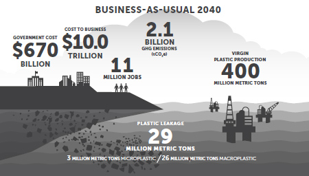 Lau博士团队提出的截至2040年的预测显示,如果按照现阶段情况发展到2040年,每年将会有2900万吨塑料垃圾流入大海,而如果启用所有手段转变体系,每年则将会流入500万吨。累计流入垃圾量为7.1亿吨。即使启用所有手段,也不能从源头上封锁塑料垃圾流入大海,海洋里的塑料还会继续扩散。但是若以目前水平持续下去,我们在未来将会经历更严重的惨剧。