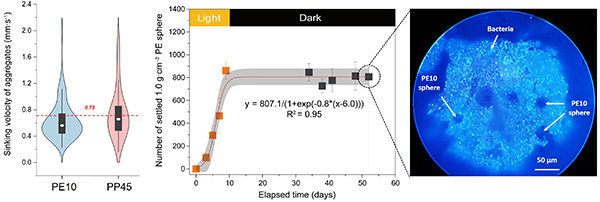 研究团队分析了5000个尺寸相对较小(10-20μm)但密度较大(密度:1.0 g/cm3)的聚乙烯(PE)微塑料凝聚体,其中有28%在20天内沉降。但在1250个尺寸较大(45-75μm)但密度较小(密度:0.91 g/cm3)的聚丙烯(PP)微塑料凝聚体中,同一时间内只有1.8%沉降。这表明,受赤潮异弯藻影响而形成的微塑料凝聚体,密度越大越容易沉入海底。