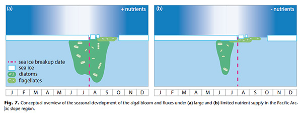 研究显示,气候变化使北极海冰加速崩解,导致栖息于海冰的微藻脱落并沉入深海的时间点提前。同时,微藻类的食物——营养盐供应发生变化,其产量与沉降持续性也会发生改变。营养盐充足时,生产与沉降过程会持续较长时间;而营养盐不足时,沉降量则呈现减少趋势。